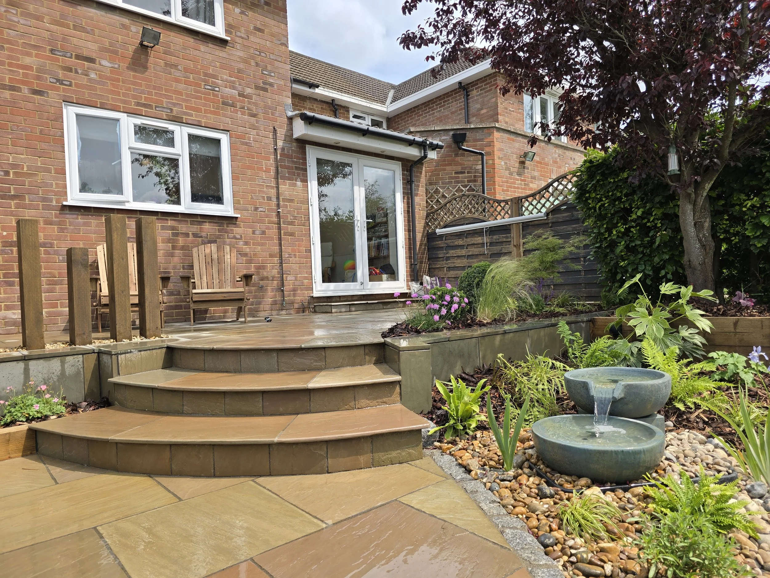 A set of gentle curved steps, flanked by Grey Sawn Sandstone clad retaining walls, lead down past a water feature — a cascading Aquascape bowl framed with ferns, hydrangea and fatsia — to the lower terrace in the sun.
